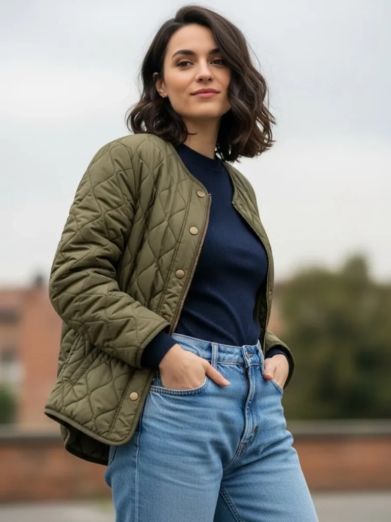 This look pairs classic blue jeans with a fitted dark top and an olive quilted jacket. The clean lines keep everything neat and wearable. The overall vibe feels modern and relaxed.