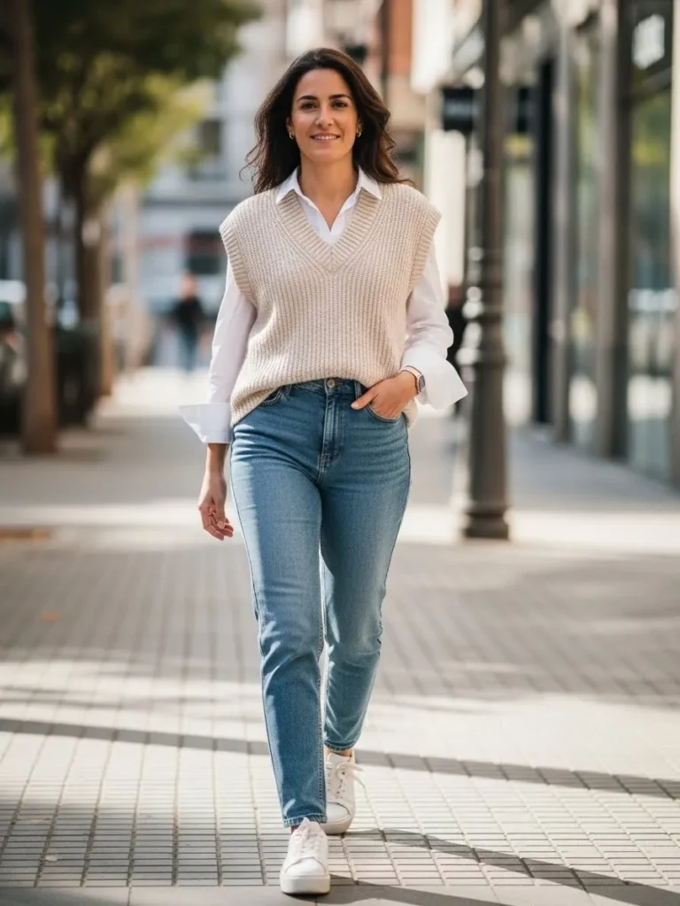 This outfit features straight leg jeans styled with a white button up shirt and a neutral sweater vest. White sneakers keep the look fresh and casual. The layering feels light but intentional.