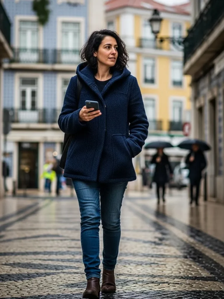 This look combines blue jeans with a textured hooded jacket in a deep navy shade. Brown ankle boots add contrast and warmth. The overall outfit feels practical and city ready.