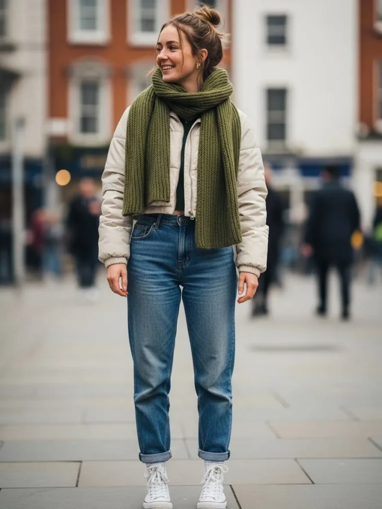 This outfit pairs relaxed blue jeans with a cropped puffer jacket and a chunky green scarf. White sneakers keep the look casual and comfortable. The proportions feel balanced and modern.