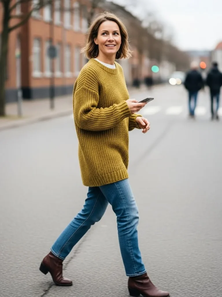 This look features classic blue jeans styled with a chunky knit sweater in a warm earthy shade. The sweater has a relaxed fit that feels cozy and approachable. Ankle boots add a bit of polish while still keeping things practical for colder days.