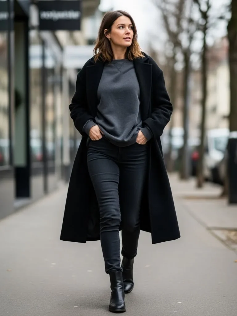 This look features black jeans styled with a simple gray sweatshirt and a long black coat layered on top. Black ankle boots finish the outfit with a clean and minimal touch. The overall vibe feels modern, comfortable, and city ready.
