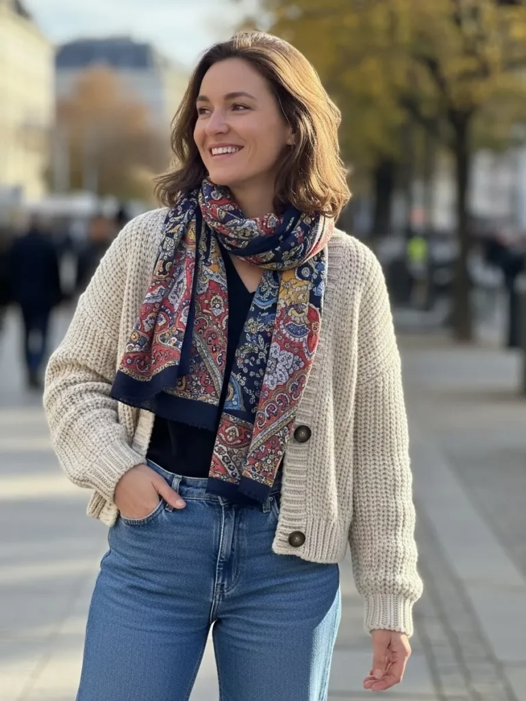 This outfit pairs classic blue jeans with a soft chunky knit cardigan in a light neutral shade. A patterned scarf adds color and personality while a simple dark top keeps everything balanced. The textures feel warm and relaxed, perfect for everyday cold weather.