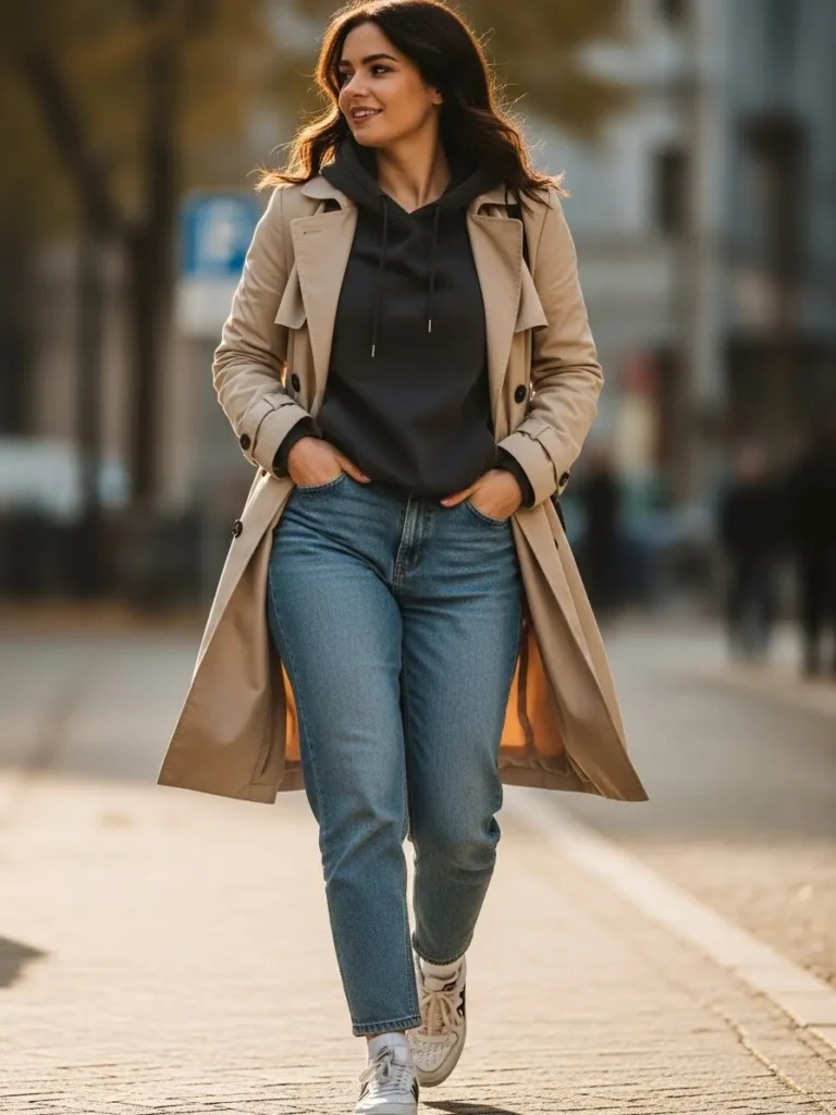 This outfit mixes a classic trench coat with a casual dark hoodie and blue jeans. White sneakers tie everything together in a relaxed way. The layers feel practical and modern, perfect for chilly weather.