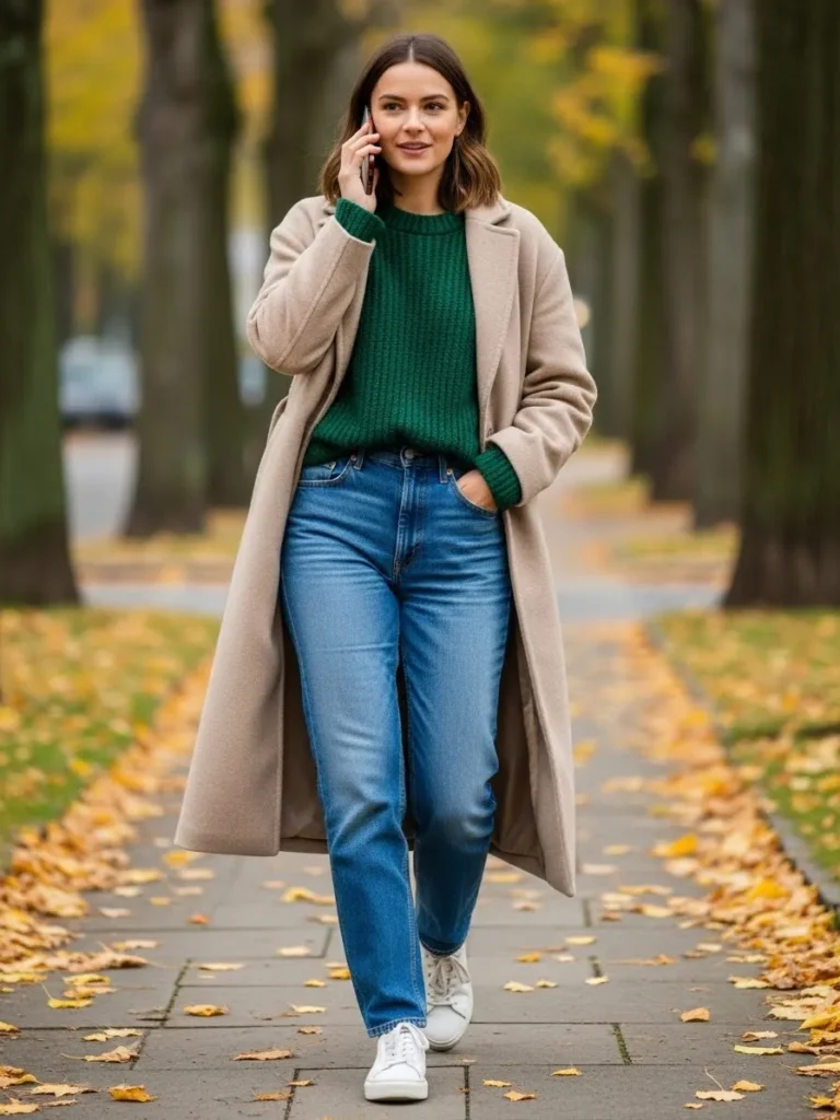 This look features straight leg jeans styled with a rich green knit sweater. A long neutral coat adds warmth and structure. White sneakers keep the outfit light and casual. The autumn setting makes the colors feel even cozier.