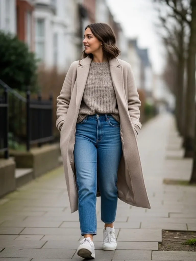 This outfit pairs classic blue jeans with a chunky knit sweater in a warm neutral tone. A long beige coat adds softness and structure at the same time. White sneakers keep it casual and wearable. The overall look feels calm, cozy, and very put together without trying too hard.