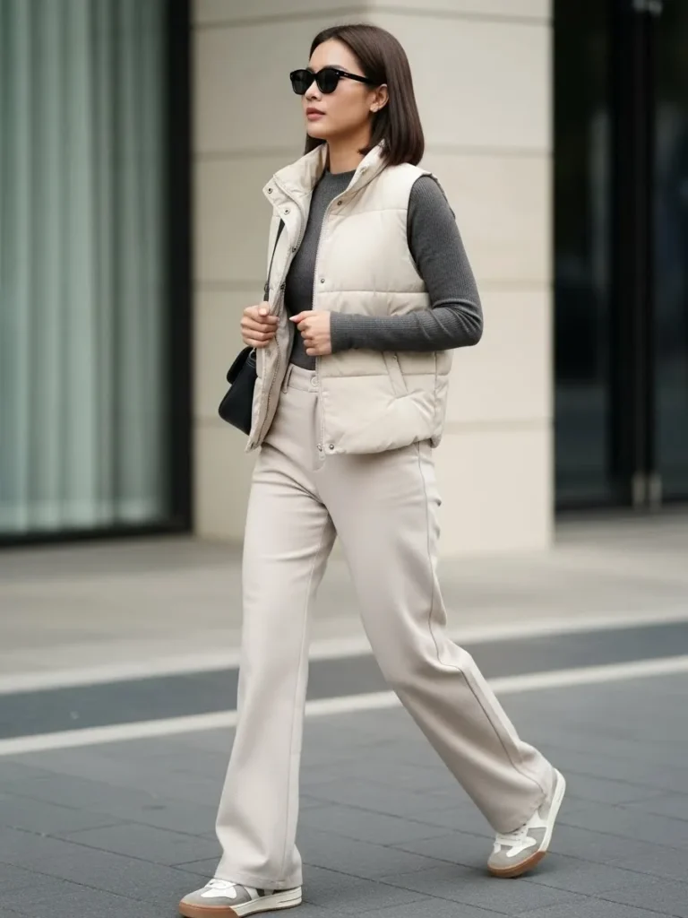This look features a matching light neutral set with relaxed trousers and a fitted long sleeve top, finished with a padded vest on top. The clean lines and soft fabrics make it feel polished while still being very comfortable. Everything stays tonal and calm.
