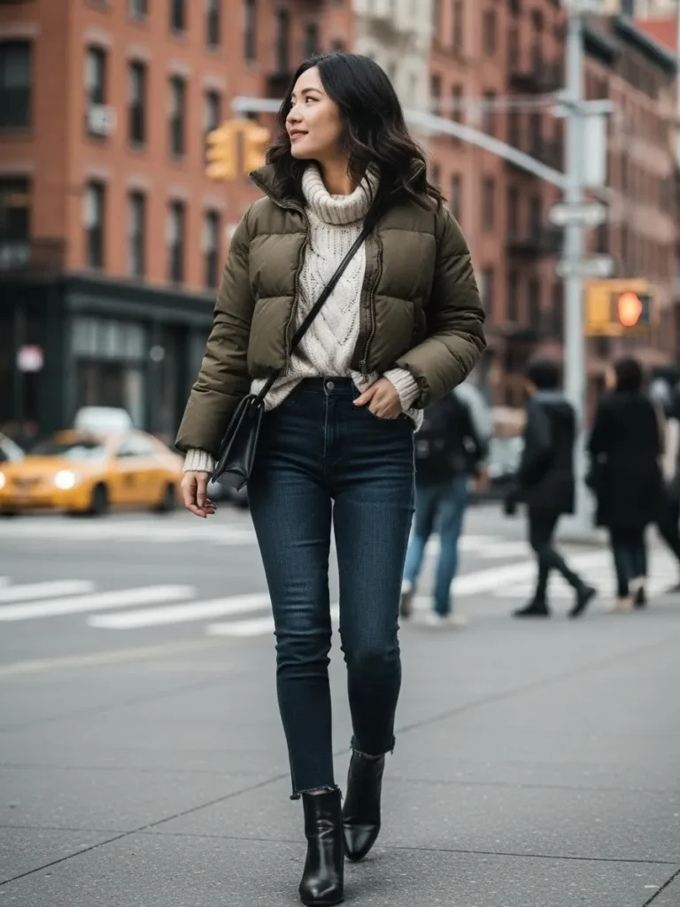 This outfit features a short puffer jacket layered over a soft sweater and classic dark jeans. Chunky boots add a bit of edge while keeping things functional for cold weather. It feels relaxed and everyday friendly.