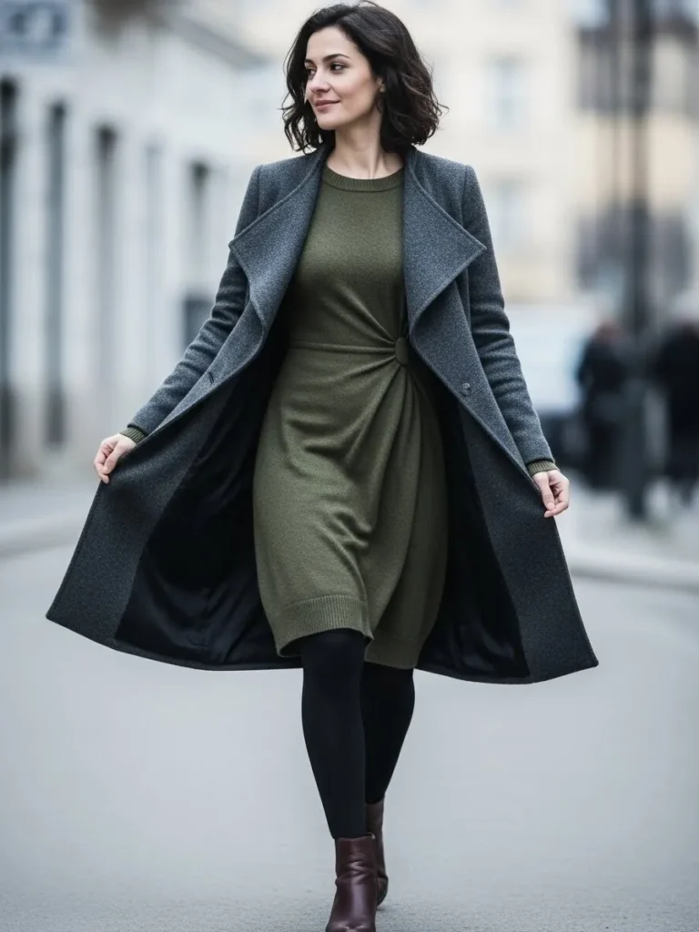 This look combines a soft knit dress with a long structured coat and tights. The dress creates a clean base while the coat adds movement and warmth. Dark boots finish the look with a polished touch.