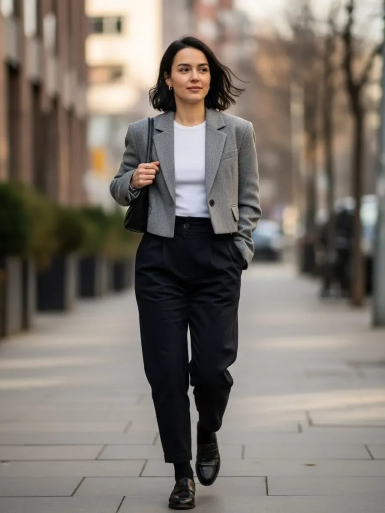 This outfit features a cropped blazer layered over a simple top with slim black trousers. Clean lines and classic colors keep the look sharp and versatile. It feels modern and city ready.