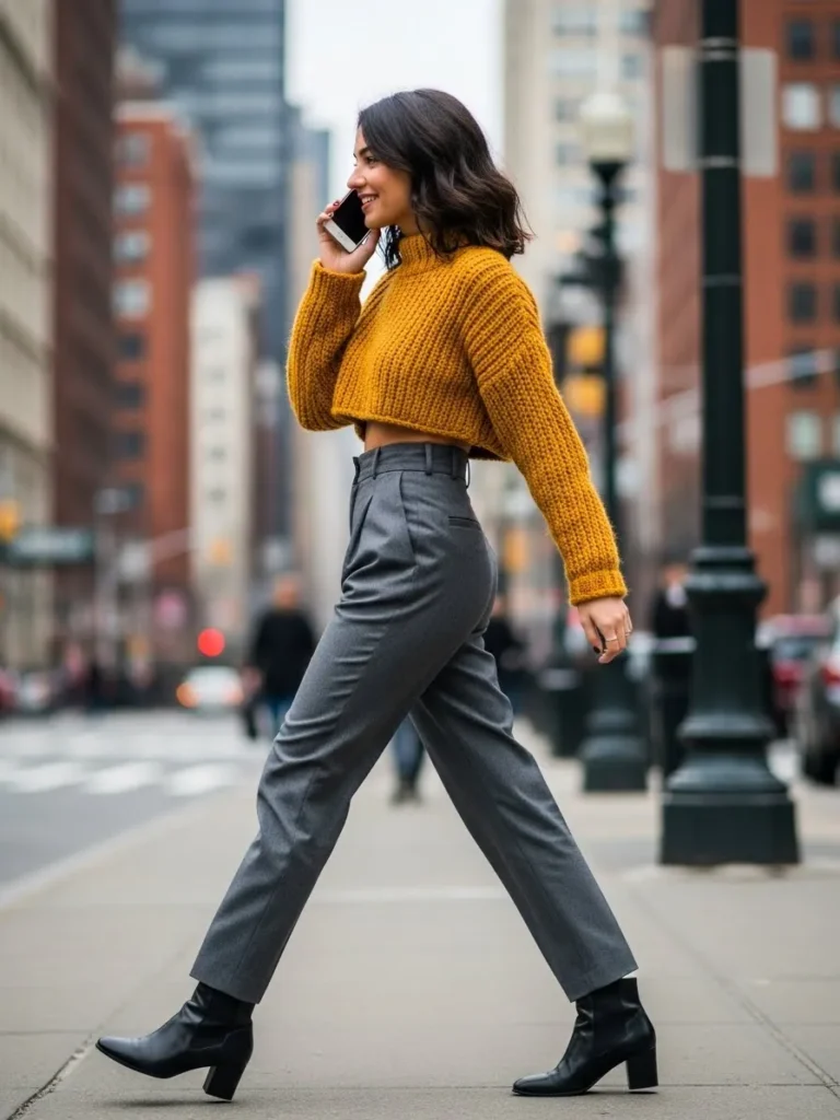 This outfit pairs a cozy mustard knit sweater with tailored gray trousers and sleek ankle boots. The sweater adds warmth and color, while the structured pants keep the look sharp and balanced. The mix of soft texture and clean tailoring feels modern and city ready.