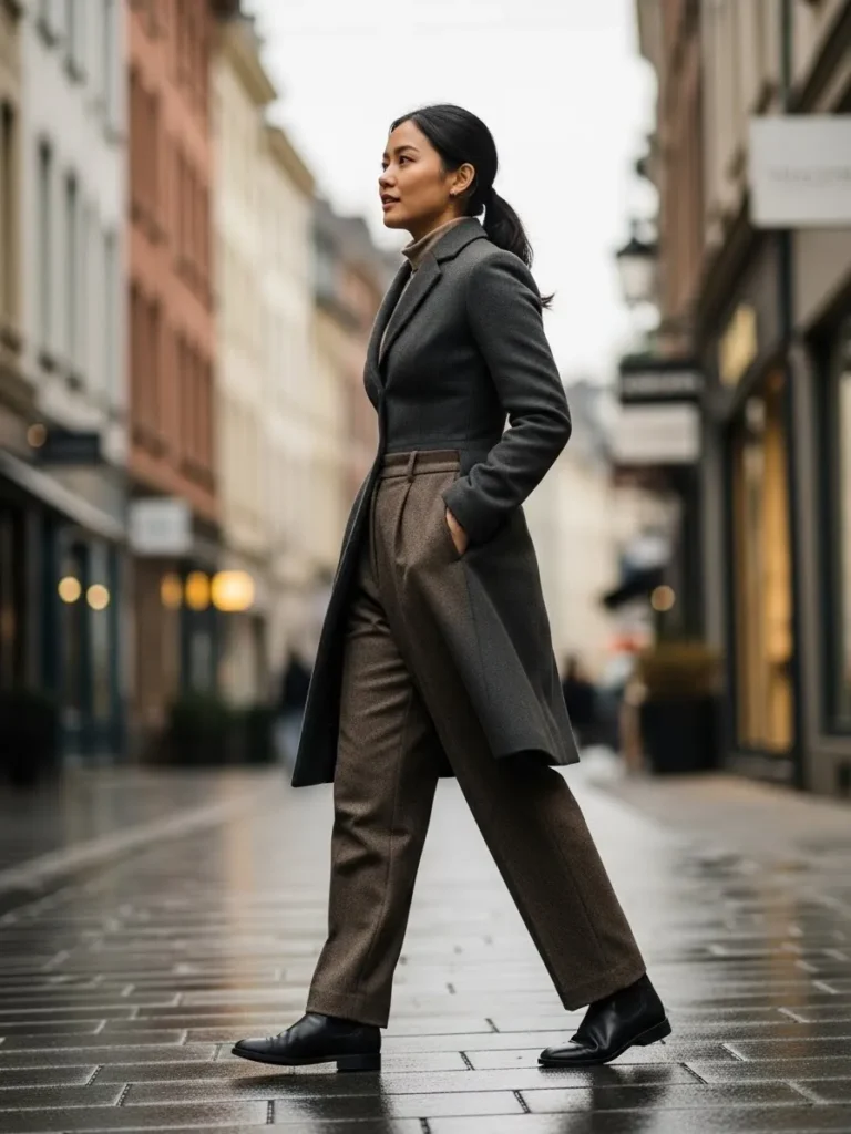 I really love how the fitted top balances out the wider pants. The long coat works because everything underneath stays streamlined. This outfit makes me feel tall and powerful even on cold days.