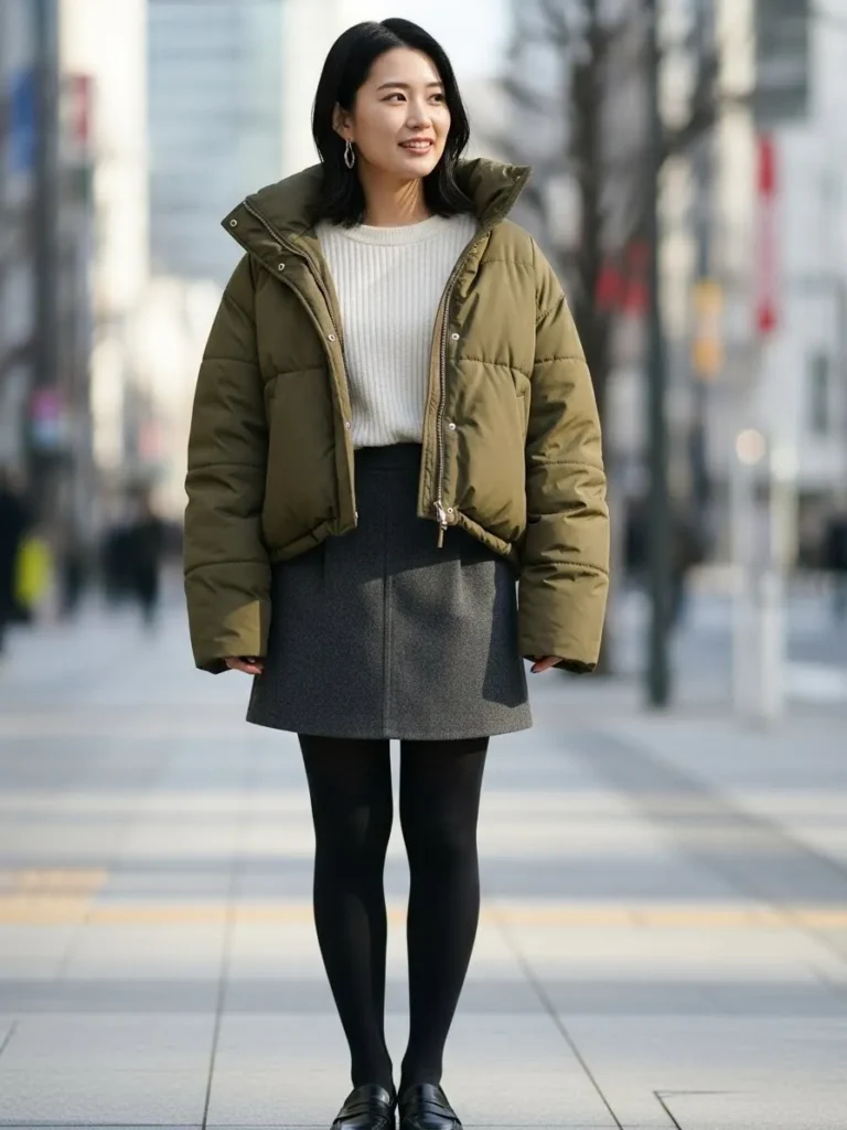 Here we have a cropped olive puffer jacket paired with a soft knit sweater and a mini skirt layered with tights. The shorter jacket keeps the look light and playful, while the tights and boots add warmth without bulk. It feels youthful, cozy, and perfect for cold days that still call for something cute.