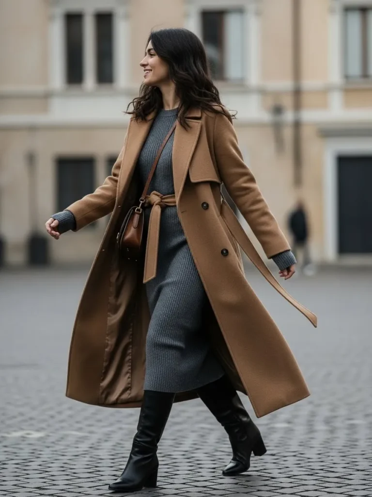 This look combines a long camel coat with a fitted knit dress and sleek black boots. The dress hugs the body gently, while the coat flows as you walk, creating movement without extra volume. The color palette stays warm and timeless.