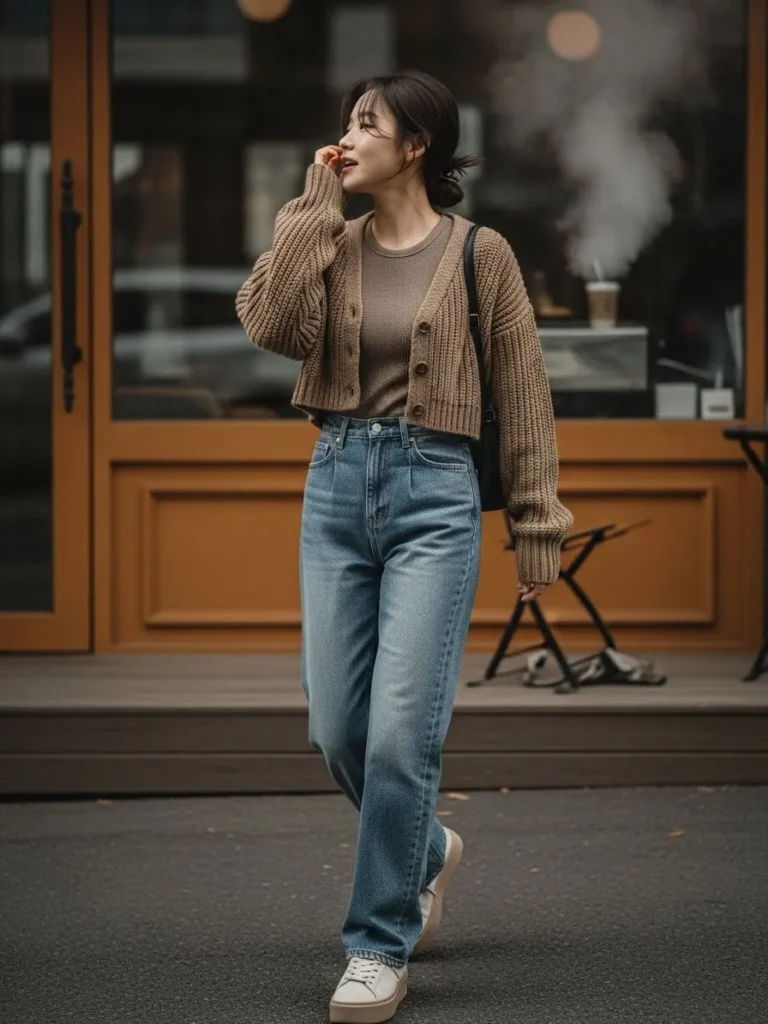 This outfit keeps things casual with a cropped cardigan layered over a simple top and relaxed straight leg jeans. Light denim keeps the look fresh, while neutral knits add warmth and texture. It feels easy, cozy, and very wearable.