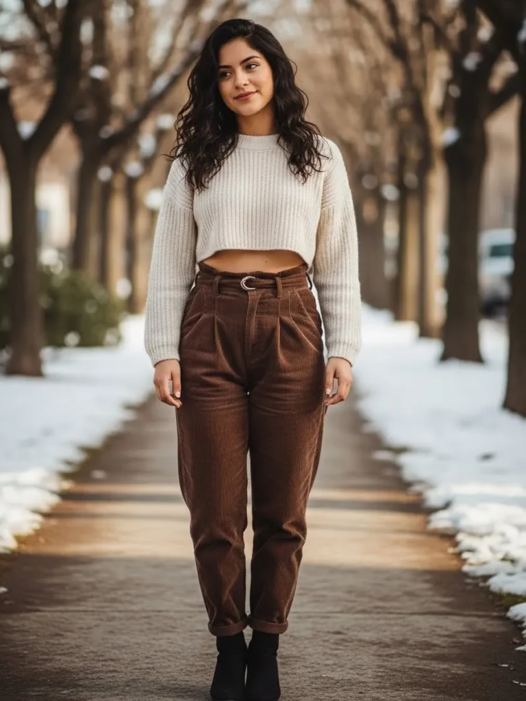 This outfit pairs a soft cream knit sweater with high waisted brown trousers that sit perfectly at the natural waist. The trousers are slightly tailored with a relaxed leg, while the knit keeps the look cozy and feminine. Neutral tones make everything feel warm and very wearable for colder days.
