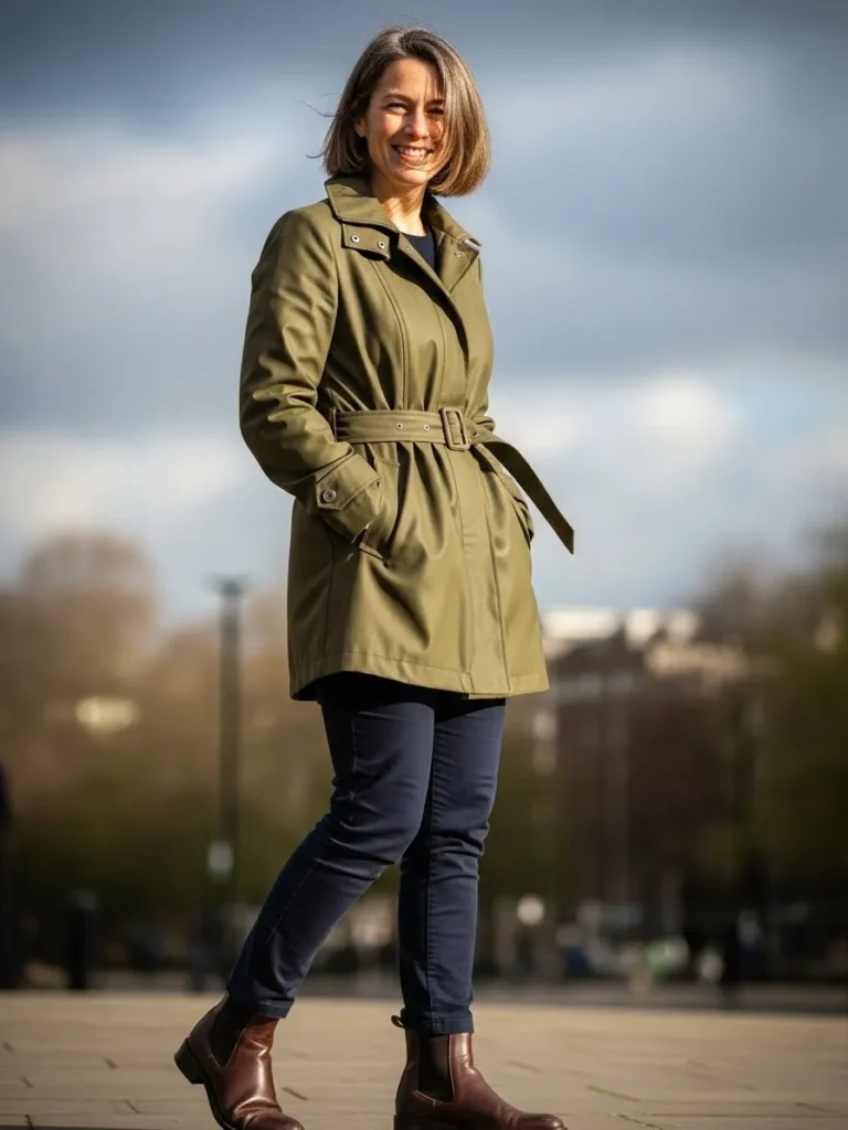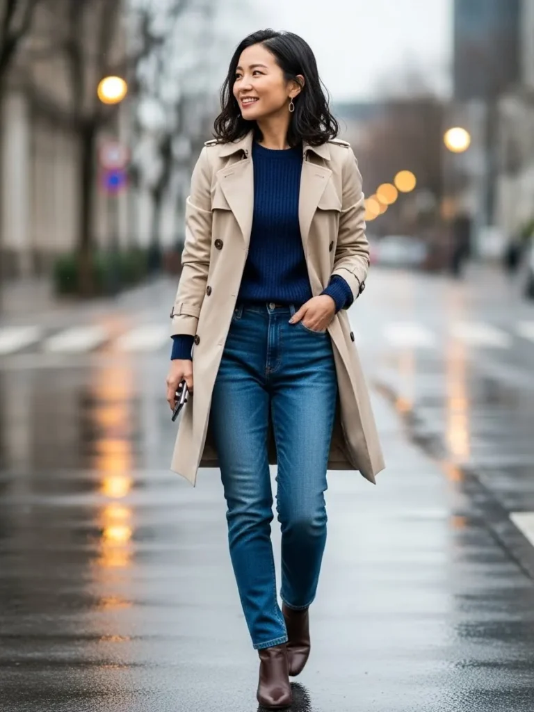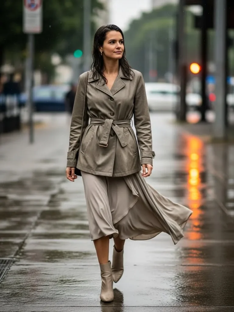 Finished with ankle boots and minimal accessories it feels polished but still very wearable for a rainy city walk.