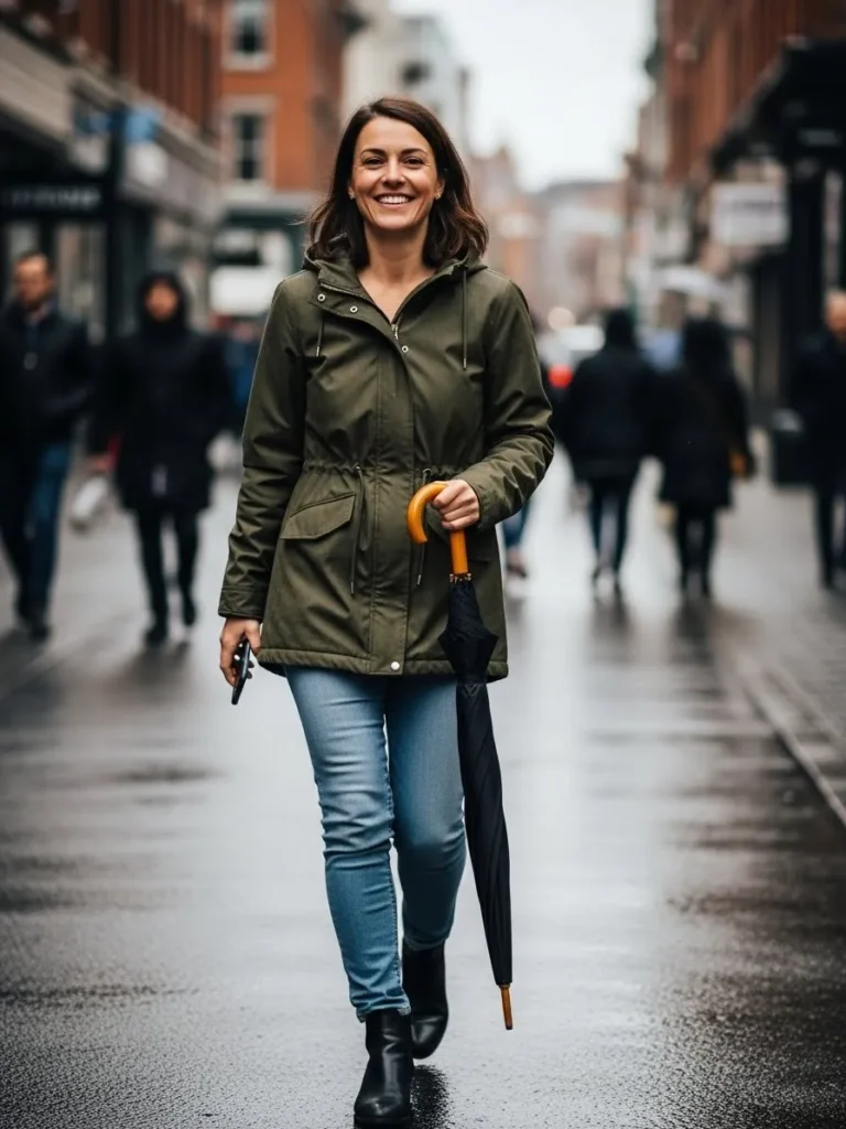 This look pairs a practical olive rain jacket with mid wash blue jeans and simple ankle boots.