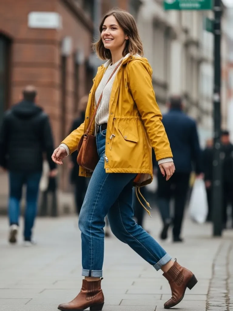This look features a mustard yellow rain jacket layered over a simple top and cuffed blue jeans.