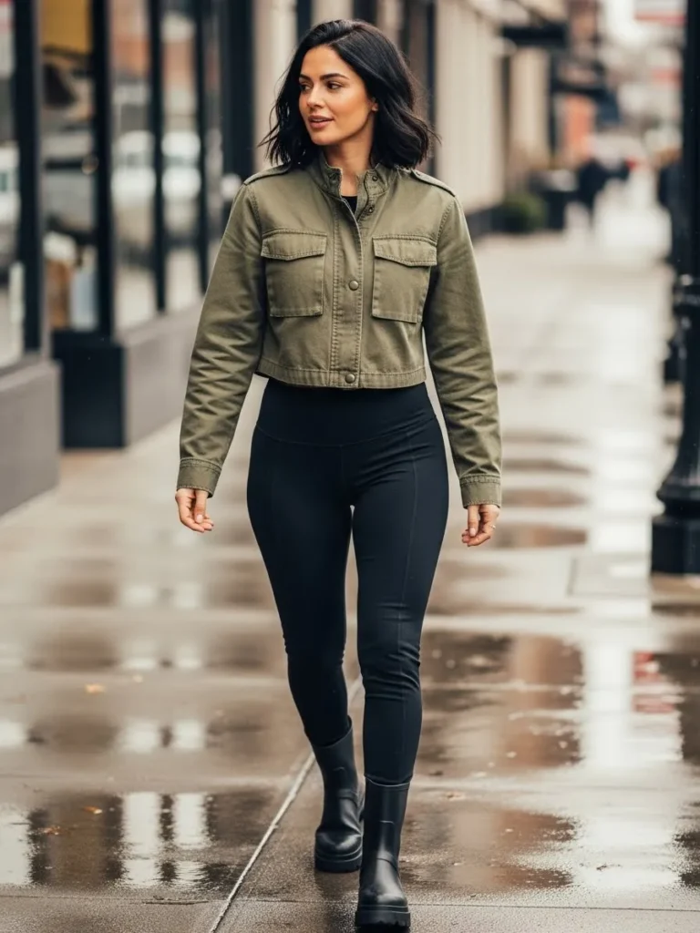 This look pairs a cropped olive jacket with high waisted black fitted pants and ankle boots.