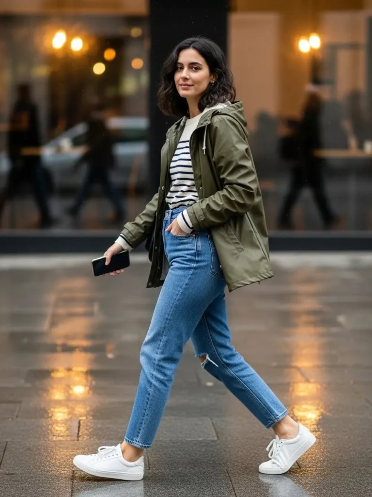 White sneakers keep the look fresh and relaxed while the jacket adds just enough rain ready structure.