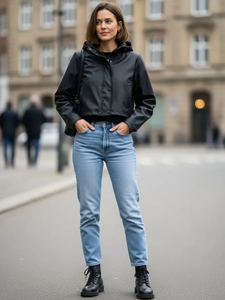This outfit features a black rain jacket paired with straight leg blue jeans and black boots.
