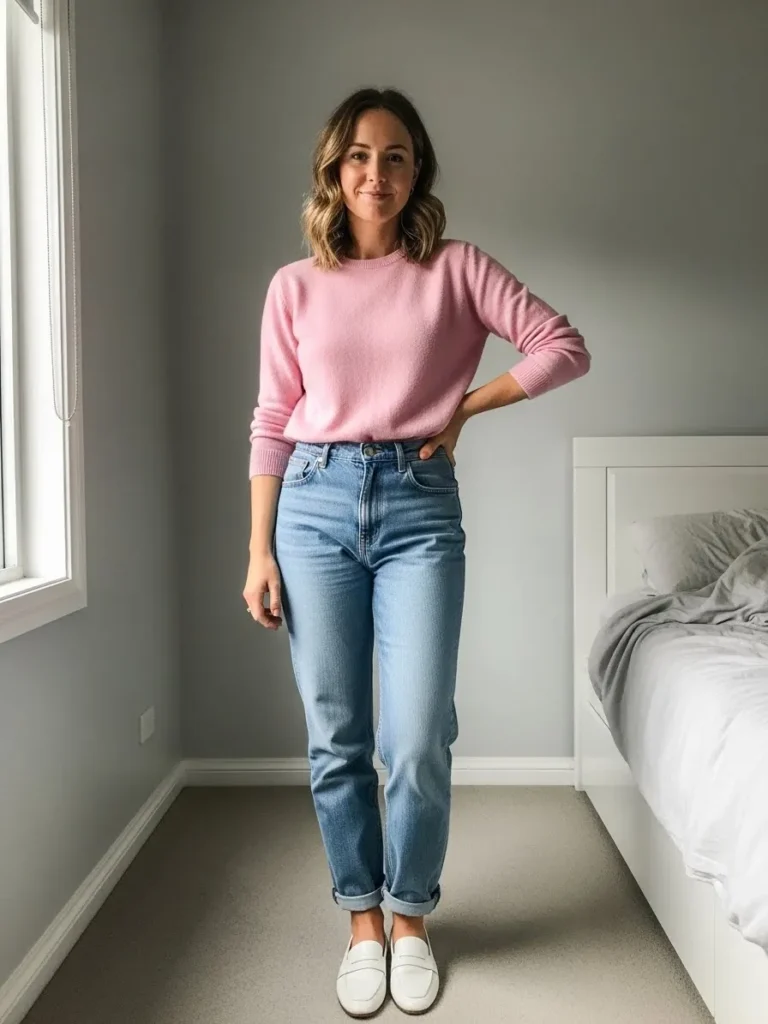 This look includes a soft pink sweater tucked casually into light wash jeans, finished with white loafers for a clean and cozy vibe.