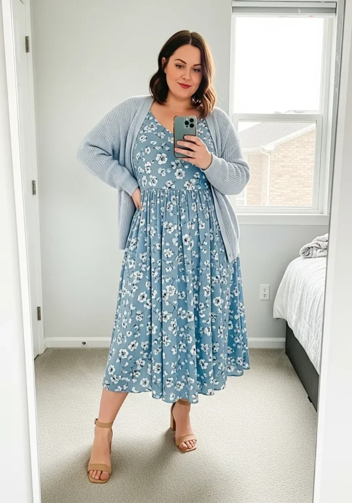 This dreamy dusty blue midi dress features a delicate floral print that feels perfectly on theme for spring. The flowy skirt hits mid calf and creates such a romantic silhouette, while the soft fabric skims the body without clinging. Layered with a lightweight cardigan in a coordinating blue tone, the outfit feels cozy yet put together. Nude sandals finish the look with a subtle, leg lengthening touch.