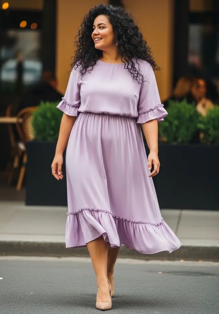This lilac midi dress instantly stands out with its soft ruffle sleeves and flowy tiered hem. The pastel purple shade is playful and fresh, and the lightweight fabric gives it a breezy feel that is perfect for warmer spring days. The relaxed waist and gentle drape over the hips create a flattering A line shape. Simple nude heels keep the focus on that gorgeous color.