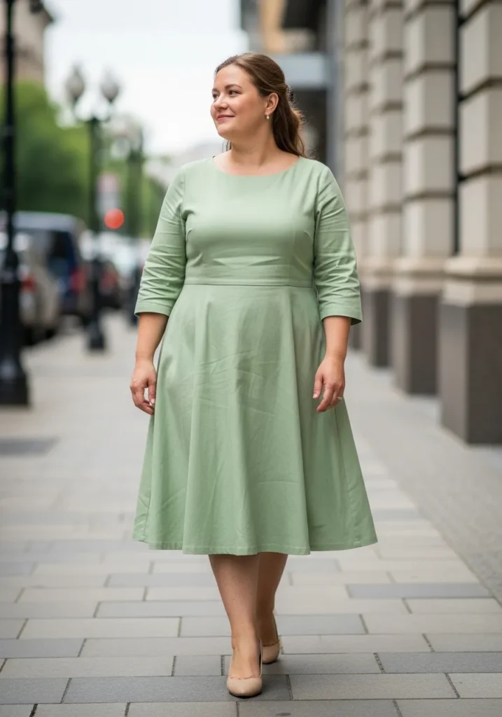 I always gravitate toward sage for daytime events because it feels fresh without being too bold. The structured waist gives beautiful definition, and the flared skirt creates that lovely balanced shape that so many of us adore. To me, this is the kind of dress that makes you stand a little taller the moment you put it on.