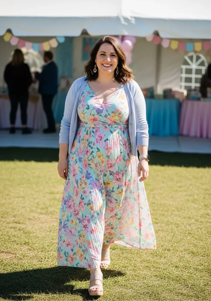 I really appreciate how effortless this combination feels. The blue tone is calm and flattering, and the cardigan gives just the right amount of coverage without hiding the shape of the dress. I would choose this for a more intimate indoor baby shower because it feels classy, comfortable, and easy to move around in.