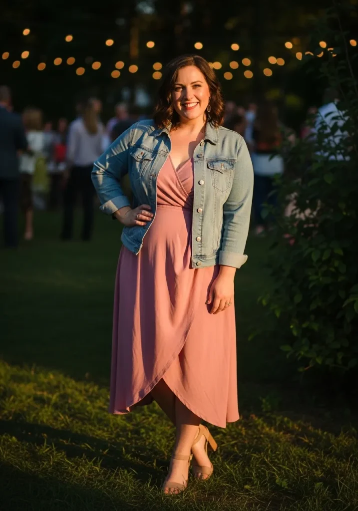 I adore how the denim jacket makes this outfit feel approachable and modern. It is the kind of combo I reach for when I want to tone down a dress just a little while still looking put together. The dusty rose shade is so flattering on plus size curves, and I love how the flowing shape creates movement without clinging. It feels sweet, stylish, and completely baby shower appropriate.