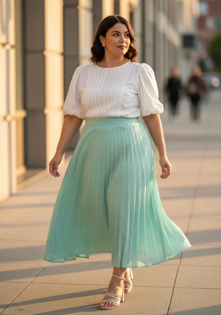 Mint Pleated Skirt with Soft White Blouse