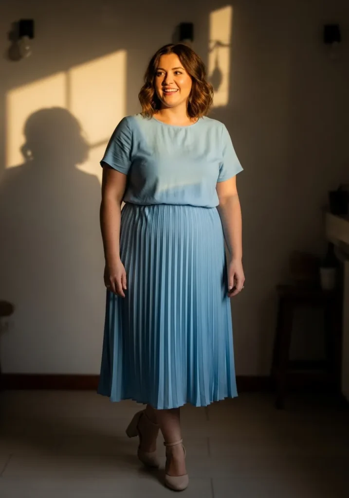 I am always drawn to pleated skirts because they give such a graceful shape without adding bulk. The soft blue shade feels soothing and elegant, and I find it incredibly flattering for spring events. It is one of those outfits that feels modest, chic, and comfortable all at once, which makes me feel confident from the moment I step into the room.