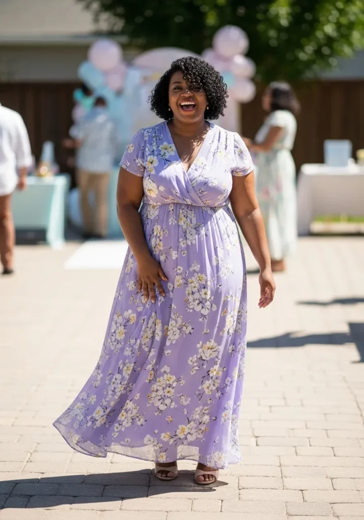 Wrap dresses are one of my favorite styles for plus size events because they highlight the waist and create such a gorgeous silhouette. I think the soft purple shade is especially sweet for a baby shower, and the flowing skirt makes it feel elegant while still being totally comfortable for mingling and photos.