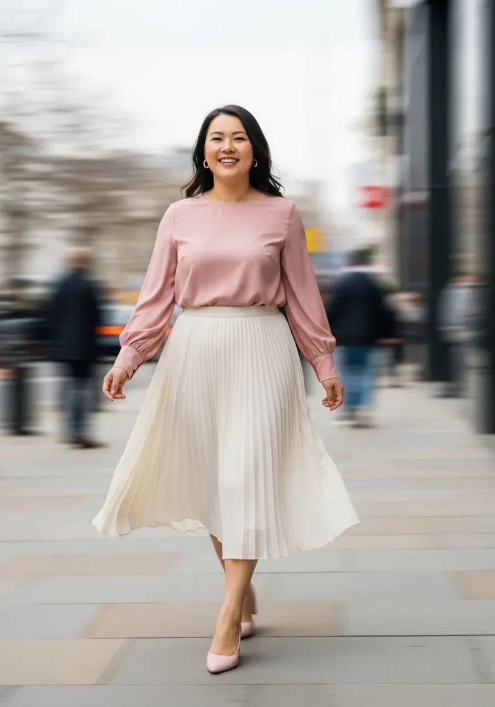 This look combines a blush pink long sleeve blouse with a cream pleated midi skirt. The top has a relaxed drape that tucks neatly into the high waisted skirt, and the soft color palette feels light and dreamy. Paired with nude heels, it creates a romantic and refined spring outfit.