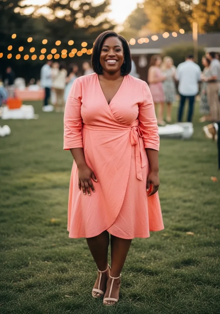 This peach wrap dress is the definition of fresh and feminine for a spring baby shower. The soft coral tone feels warm and happy, while the wrap silhouette gently cinches at the waist with a side tie that creates beautiful shape. The knee length hem keeps it classy and comfortable, and the lightweight fabric moves easily with every step. Paired with neutral heels and simple jewelry, the whole look feels polished but still relaxed enough for an outdoor celebration.