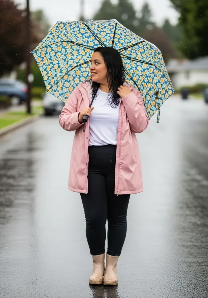 Soft rose tones always make rainy outfits feel more fun to me. The color looks flattering and adds warmth even when the weather feels chilly. This look feels relaxed and cute which makes it perfect for a peaceful rainy walk.