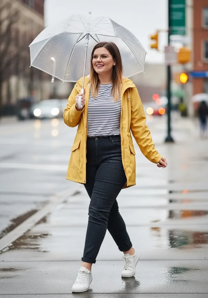 A cheerful yellow raincoat brightens the street while a striped top underneath adds a bit of classic pattern. Slim black jeans keep the look sleek and balanced while white sneakers make walking through wet streets easy. A clear umbrella finishes the outfit and lets the bright colors shine through.