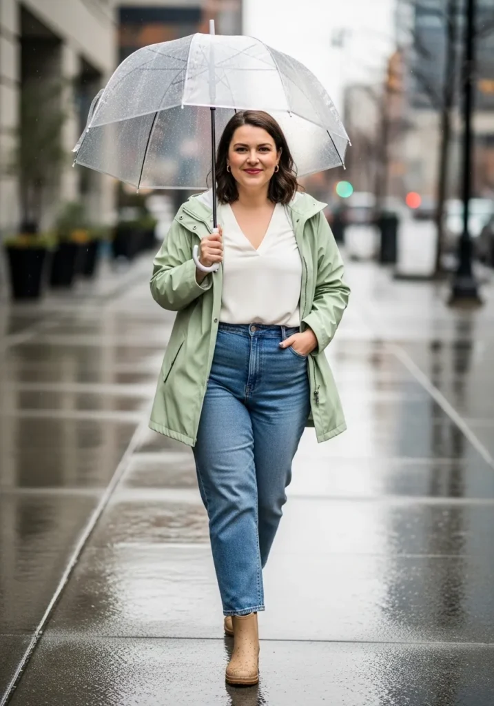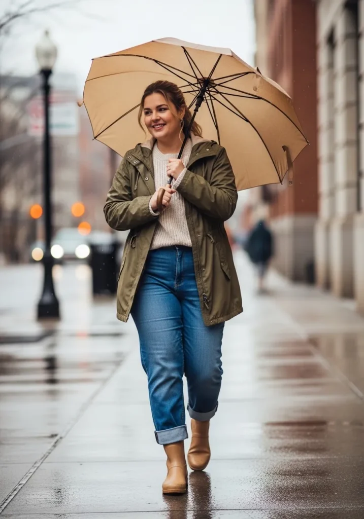 An olive green rain jacket gives this look a slightly earthy feel that works beautifully with denim. The outfit pairs a simple top with straight blue jeans and tan ankle boots that handle wet sidewalks well. A neutral umbrella keeps the whole outfit soft and balanced.