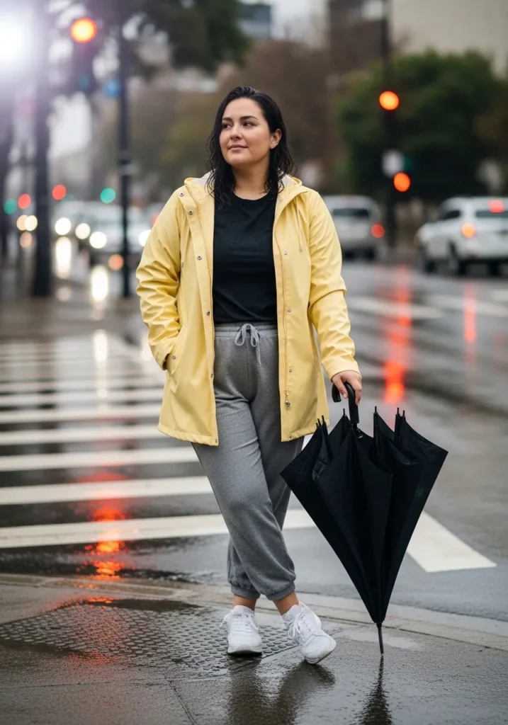 A soft light yellow jacket creates a gentle pop of color against a rainy city backdrop. Underneath sits a dark top paired with relaxed gray joggers that bring comfort and movement. White sneakers keep the look casual while a folded umbrella in hand hints that the rain just passed.