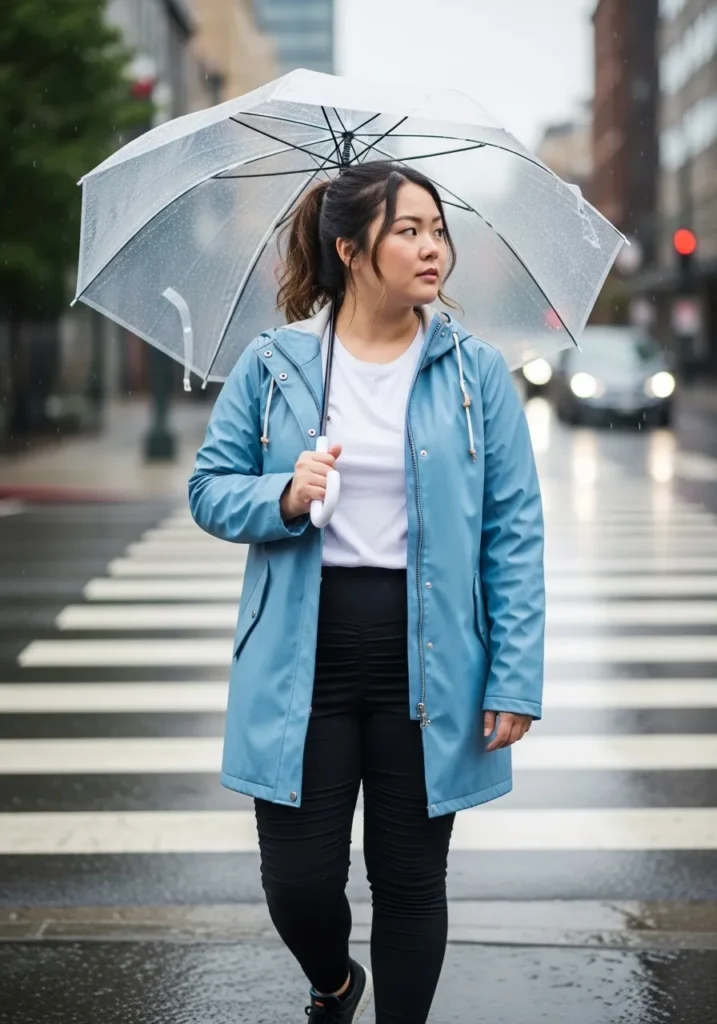 A fresh sky blue raincoat brings a light spring feel to this outfit while a simple white top underneath keeps the look clean and classic. Black leggings add a sleek silhouette that balances the slightly oversized jacket. White sneakers keep the outfit casual and easy for walking through the city. A clear umbrella lets the soft blue color stay the star of the look.