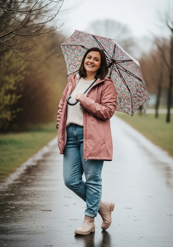 A dusty rose rain jacket adds a soft feminine tone that works beautifully with casual spring denim. The outfit pairs a neutral top with relaxed blue jeans that show gentle creases at the knee. Neutral ankle boots keep the outfit practical for wet pavement while a patterned umbrella adds charm and personality.