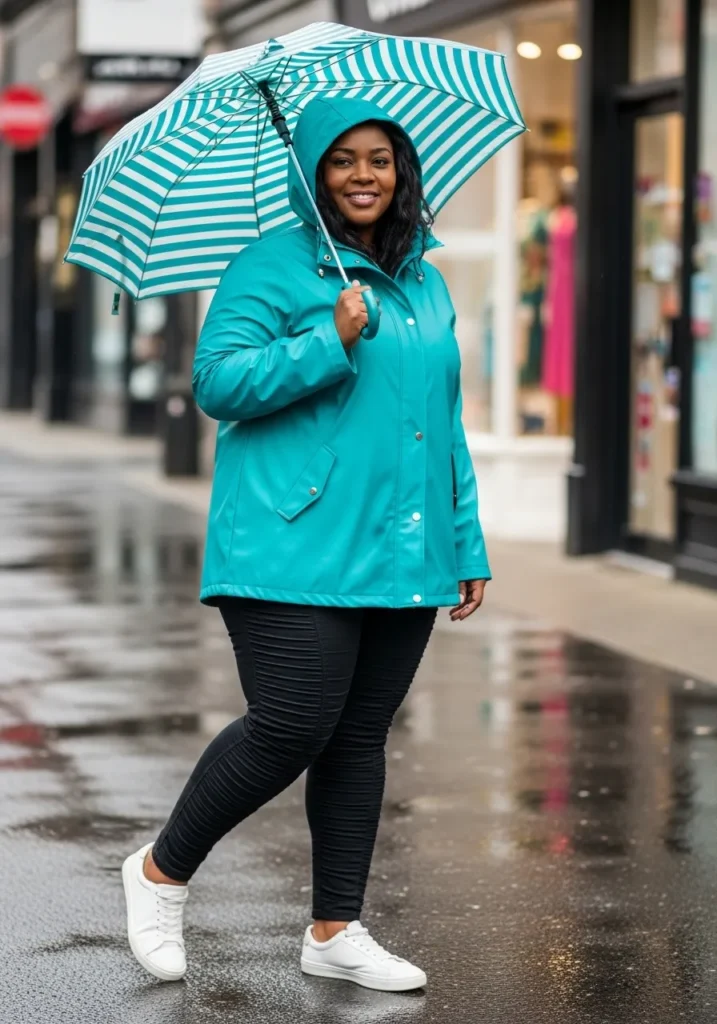A bright teal raincoat instantly catches the eye and adds energy to a gray day. The jacket is styled with simple black leggings and crisp white sneakers that keep the look sporty and comfortable. A striped umbrella adds playful pattern while the glossy pavement reflects the vibrant jacket color.