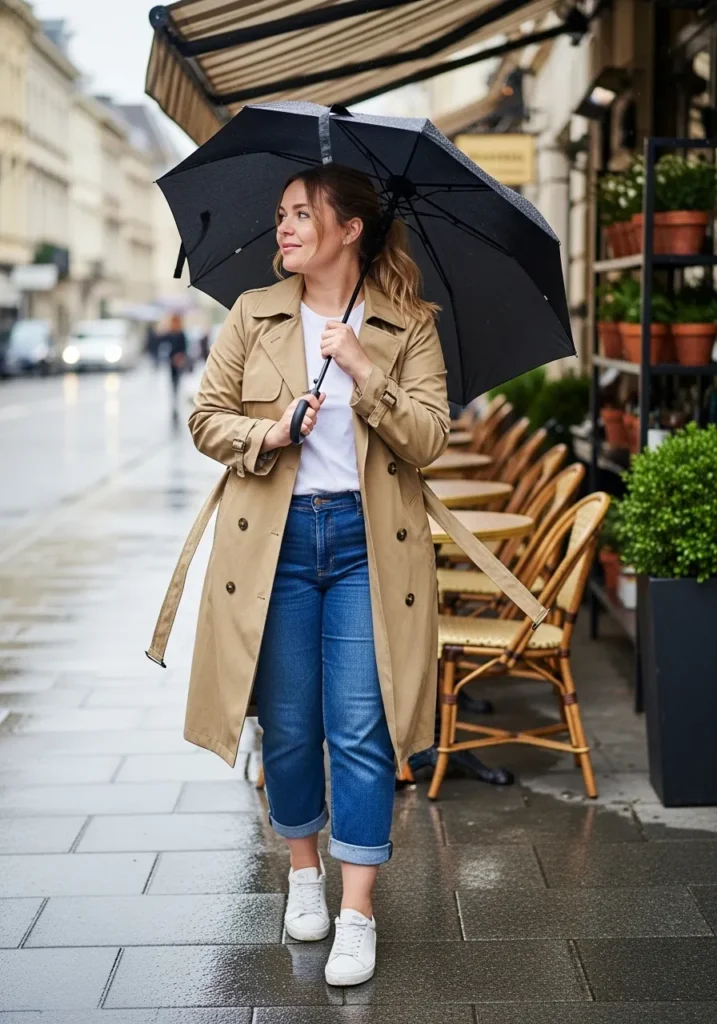 A timeless beige trench coat gives this rainy day outfit a polished and slightly elevated feel. Underneath sits a simple top with straight leg blue jeans that have soft folds and cuffs at the ankle. White sneakers keep the look casual while a black umbrella adds a bit of classic contrast.