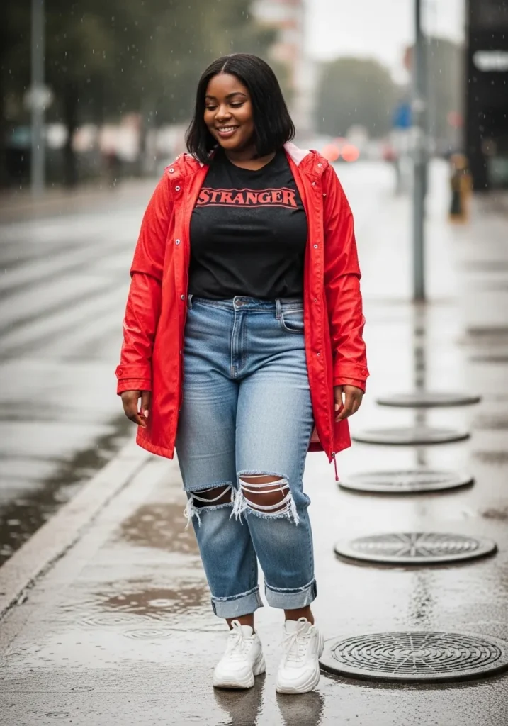 A vibrant red rain jacket instantly becomes the highlight of this casual street outfit. The jacket is styled with a graphic black top and distressed blue jeans that show natural wear and texture. White sneakers keep the outfit fresh while the wet pavement reflects the bold color beautifully.