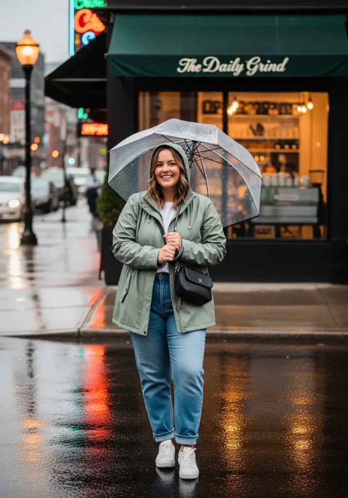 This outfit mixes comfort with a relaxed city vibe that feels perfect for a rainy afternoon coffee run. A sage green rain jacket sits over a cozy sweater and straight leg blue jeans with soft cuffs at the ankle. White sneakers keep the look fresh and easy to walk in while a clear umbrella lets the outfit stay visible even in the rain. The wet city street and glowing café lights make the whole look feel warm and inviting.