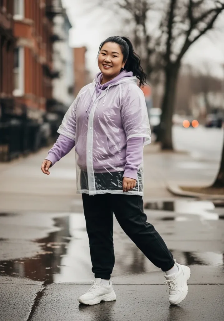A soft lavender hoodie brings a cozy feel to this casual rainy day outfit. It is paired with relaxed black jogger pants and bright white sneakers that keep the look sporty and fresh. The lightweight fabric and easy silhouette make it perfect for cool spring rain while the relaxed movement of the outfit adds a laid back vibe.