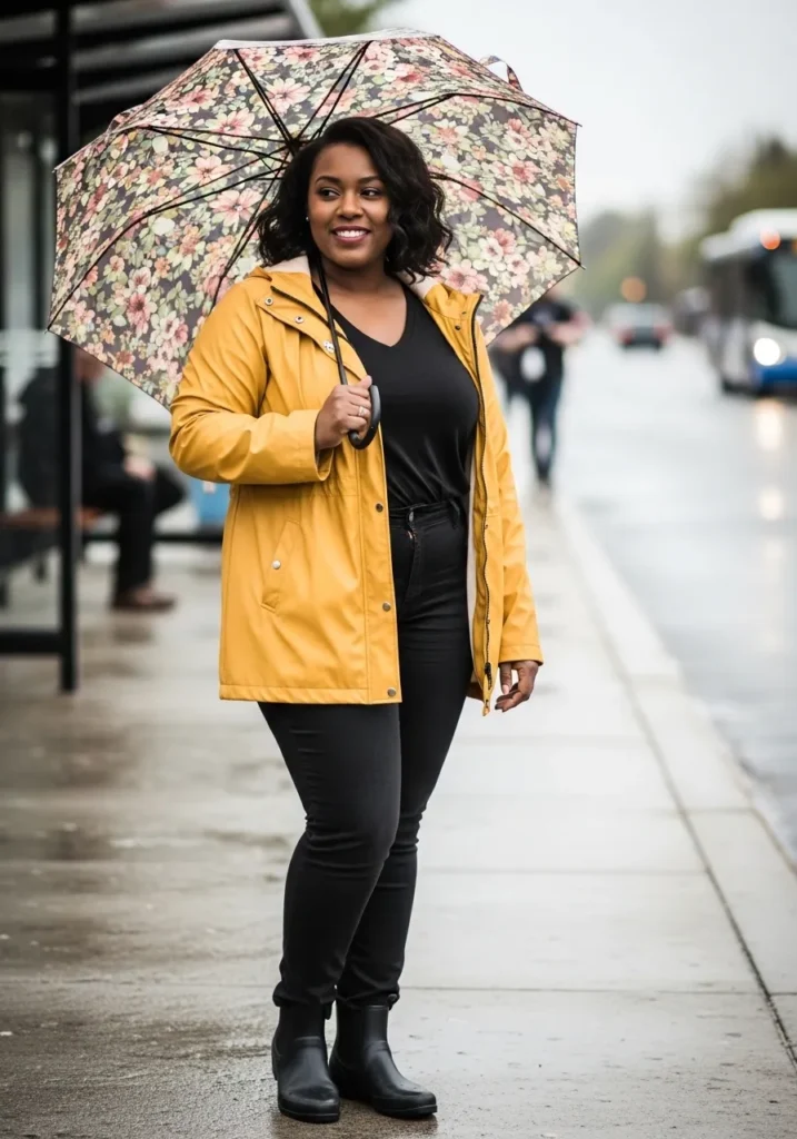 A bold mustard yellow raincoat instantly stands out against the rainy street. Underneath sits a dark top with fitted black pants and classic rain boots that are perfect for puddles. A floral umbrella adds extra charm while the bright jacket keeps the whole outfit lively even on the grayest spring day.