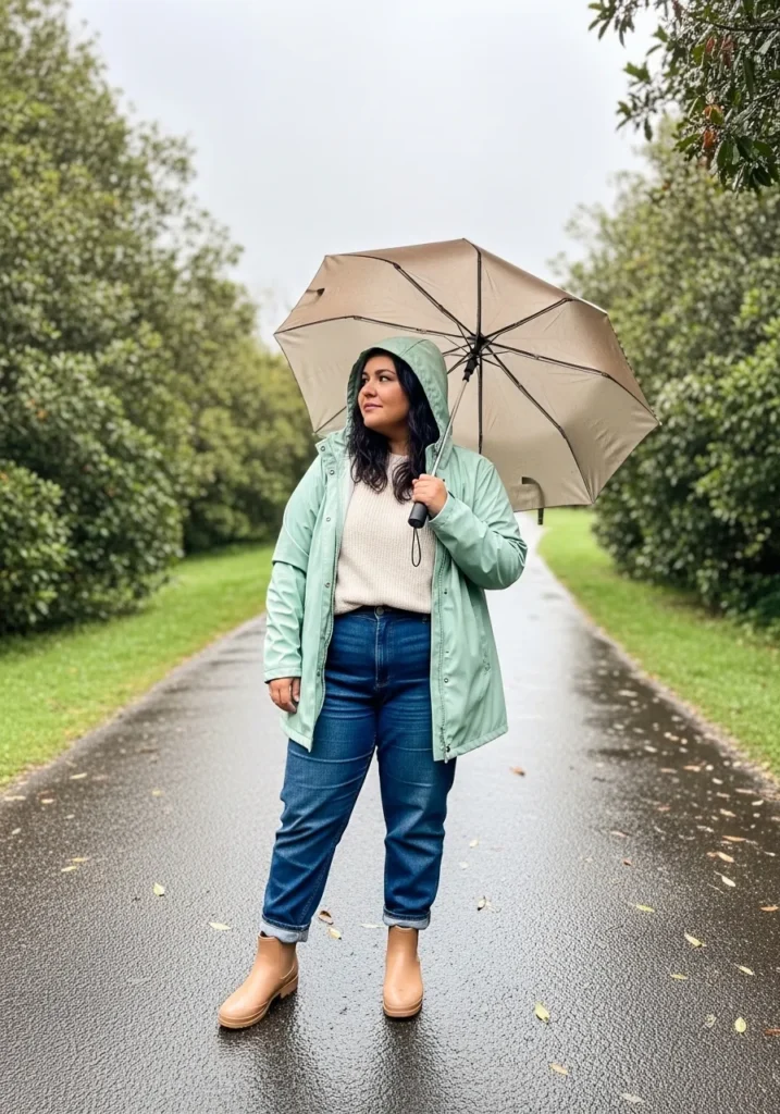 A mint green rain jacket gives this outfit a breezy spring feel that looks perfect on a quiet rainy park path. The jacket pairs with a simple top and relaxed blue jeans with gentle cuffed hems. Neutral ankle boots keep the outfit grounded while a beige umbrella softens the whole look.